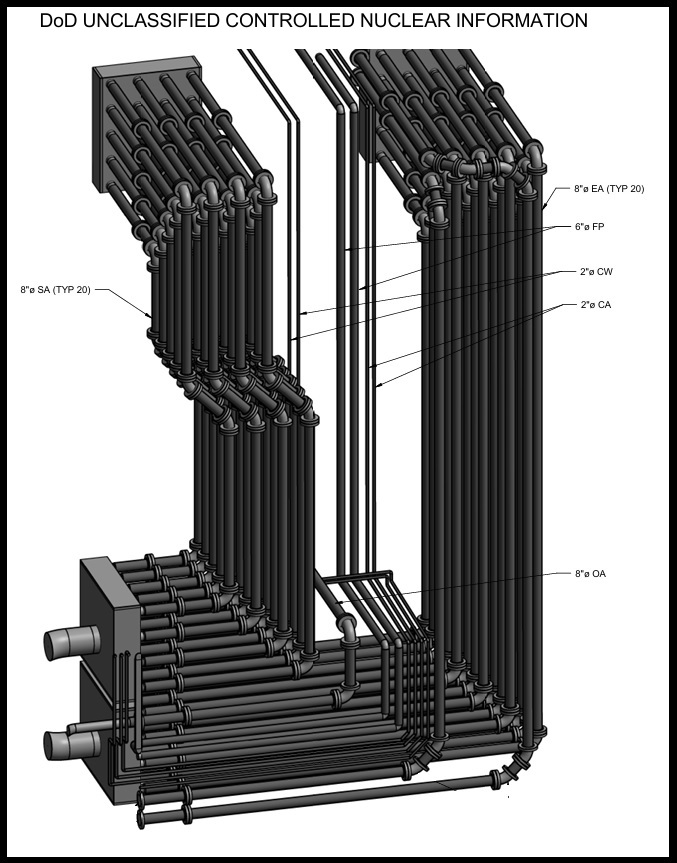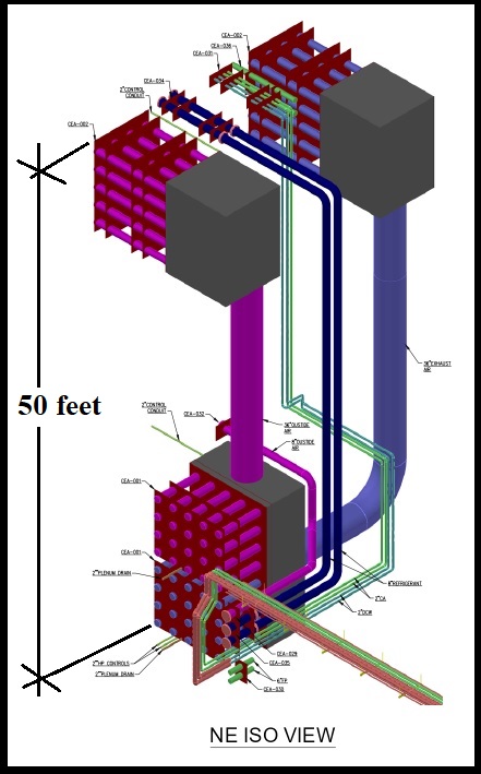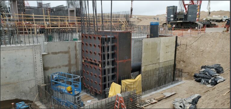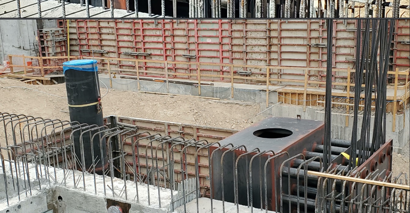 The facility was under construction from 2020-2024, under supervision by the US Army Corp of Engineers and DoD, with the participation of private engineering firms and contractors.  GES Tech Group (GES) was retained by the principle mechanical contractor to provide piping system support design and seismic bracing plus general structural, seismic, foundation and anchorage details for all air handling and HVAC equipment.  A Request for Information (RFI) submitted by GES’s client addressed a key element of the HVAC system involving a large stack of piping embedded in a 50 foot deep gravel filled concrete enclosure.  GES’s client provided the alternate design approach that addressed critical sequence of construction and buildability issues and GES was assigned the task of designing the detailed components.