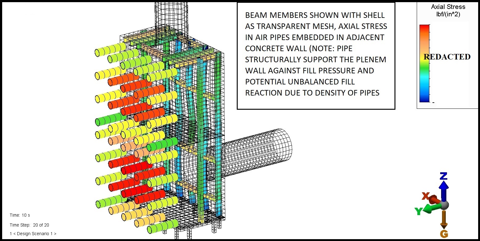 GES considered back fill pressure, system operating parameters, and thermal expansion and contraction constraints.  Non-linear finite element analysis modeling was applied during the design process.  A selection of exhibits provided as part of the RFI are presented below.